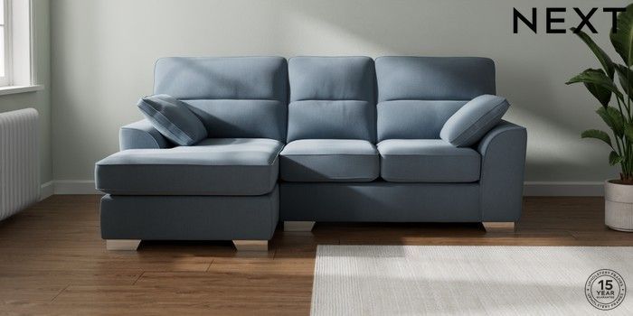 7.3.1 Buy Stamford Highback Small Sofa Chaise - Left Hand Relaxed Linen Look Mid Blue Large Square Angle - Chrome Metal from the Next UK online shop Click here to use our accessible website