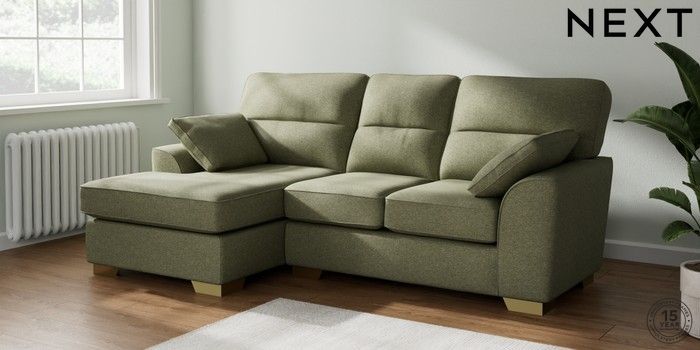 7.2.10 Buy Stamford Highback Small Sofa Chaise - Left Hand Tweedy Chenille Mid Moss Green Large Square Angle - Brushed Brass from the Next UK online shop Click here to use our accessible website