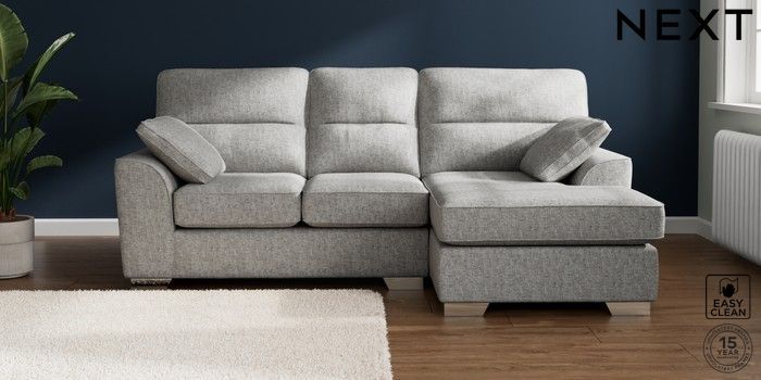 7.2.10 Buy Stamford Highback Small Sofa Chaise - Right Hand Chunky Boucle Easy Clean Light Grey Large Square Angle - Chrome Metal from the Next UK online shop Click here to use our accessible website