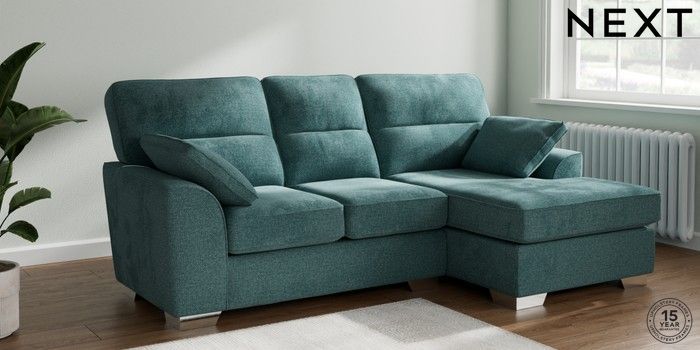 7.3.1 Buy Stamford Highback Small Sofa Chaise - Right Hand Chunky Chenille Mid Teal Green Large Square Angle - Chrome Metal from the Next UK online shop Click here to use our accessible website