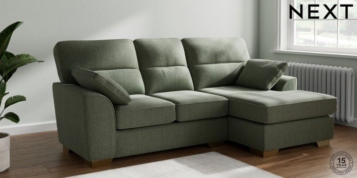 6.12.13 Buy Stamford Highback Small Sofa Chaise - Right Hand Chunky Texture Mid Forest Green Large Square Angle - Brushed Brass from the Next UK online shop Click here to use our accessible website