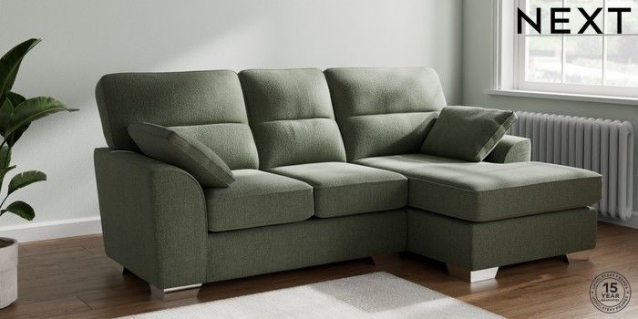 7.2.10 Buy Stamford Highback Small Sofa Chaise - Right Hand Chunky Texture Mid Forest Green Large Square Angle - Chrome Metal from the Next UK online shop Click here to use our accessible website