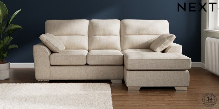 7.2.10 Buy Stamford Highback Small Sofa Chaise - Right Hand Chunky Weave Mid Natural Large Square Angle - Chrome Metal from the Next UK online shop Click here to use our accessible website