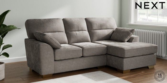 6.12.1 Buy Stamford Highback Small Sofa Chaise - Right Hand Distressed Velour French Grey Large Square Angle - Brushed Brass from the Next UK online shop Click here to use our accessible website