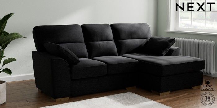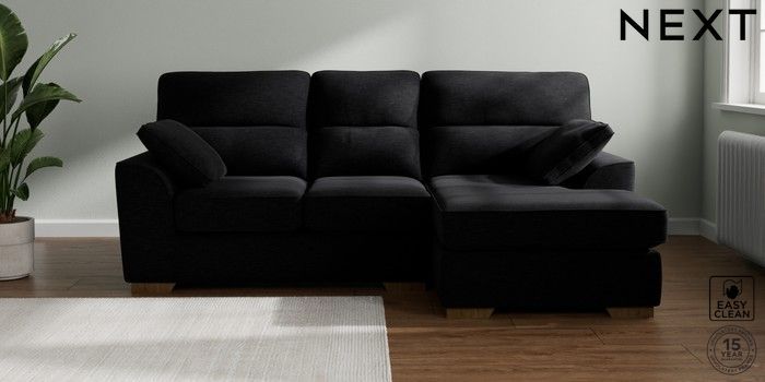 7.2.10 Buy Stamford Highback Small Sofa Chaise - Right Hand Fine Chenille Easy Clean Black Large Square Angle - Mid from the Next UK online shop Click here to use our accessible website