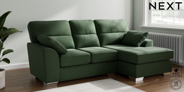 7.3.1 Buy Stamford Highback Small Sofa Chaise - Right Hand Fine Chenille Easy Clean Mid Khaki Green Large Square Angle - Chrome Metal from the Next UK online shop Click here to use our accessible website