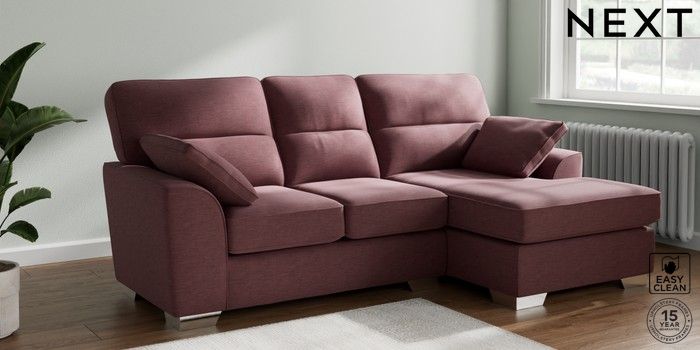 7.3.1 Buy Stamford Highback Small Sofa Chaise - Right Hand Fine Chenille Easy Clean Mid Mulberry Purple Large Square Angle - Chrome Metal from the Next UK online shop Click here to use our accessible website