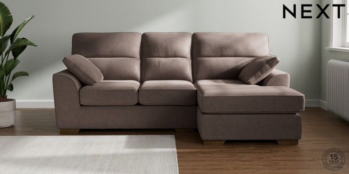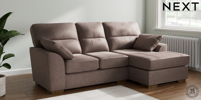 7.2.10 Buy Stamford Highback Small Sofa Chaise - Right Hand Luxe Chenille Mink Brown Large Square Angle - Mid from the Next UK online shop Click here to use our accessible website