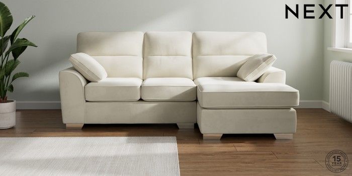 7.0.3 Buy Stamford Highback Small Sofa Chaise - Right Hand Luxe Chenille Oyster Large Square Angle - Chrome Metal from the Next UK online shop Click here to use our accessible website