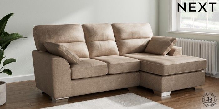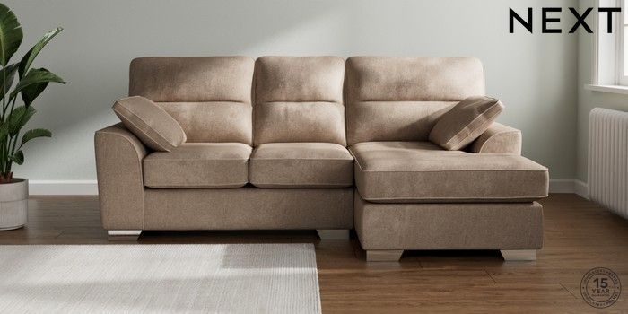 7.2.10 Buy Stamford Highback Small Sofa Chaise - Right Hand Plush Chenille Mid Natural Large Square Angle - Chrome Metal from the Next UK online shop Click here to use our accessible website