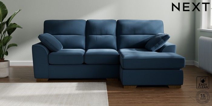 7.2.10 Buy Stamford Highback Small Sofa Chaise - Right Hand Plush Velvet Easy Clean Airforce Blue Large Square Angle - Mid from the Next UK online shop Click here to use our accessible website