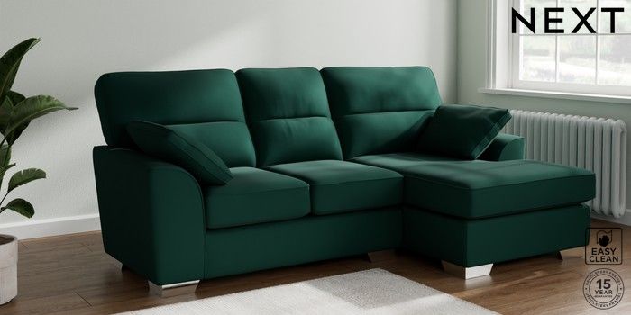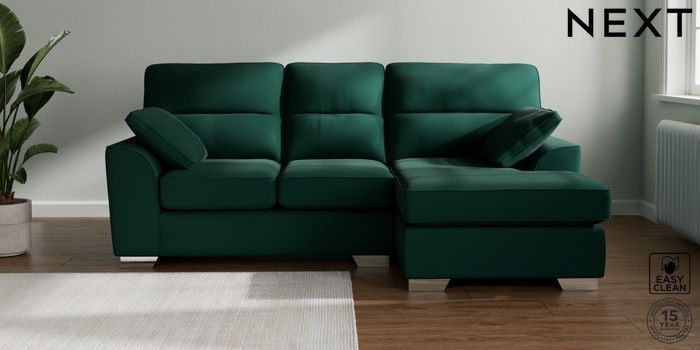 7.3.1 Buy Stamford Highback Small Sofa Chaise - Right Hand Plush Velvet Easy Clean Bottle Green Large Square Angle - Chrome Metal from the Next UK online shop Click here to use our accessible website