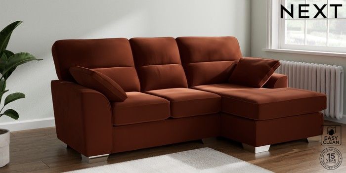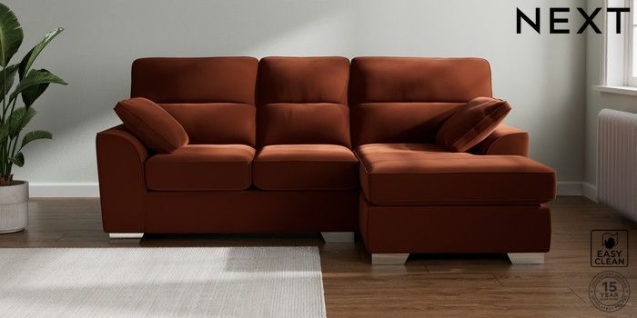 7.3.1 Buy Stamford Highback Small Sofa Chaise - Right Hand Plush Velvet Easy Clean Ginger Orange Large Square Angle - Chrome Metal from the Next UK online shop Click here to use our accessible website