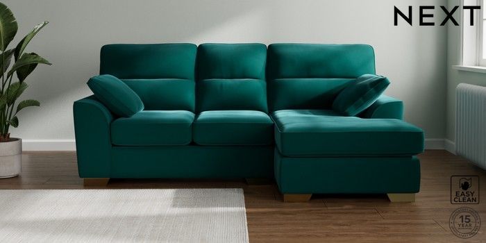 7.3.1 Buy Stamford Highback Small Sofa Chaise - Right Hand Plush Velvet Easy Clean Juniper Green Large Square Angle - Brushed Brass from the Next UK online shop Click here to use our accessible website