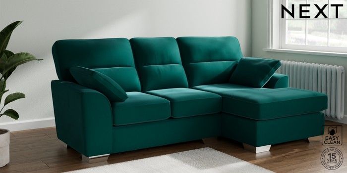 7.2.10 Buy Stamford Highback Small Sofa Chaise - Right Hand Plush Velvet Easy Clean Juniper Green Large Square Angle - Chrome Metal from the Next UK online shop Click here to use our accessible website