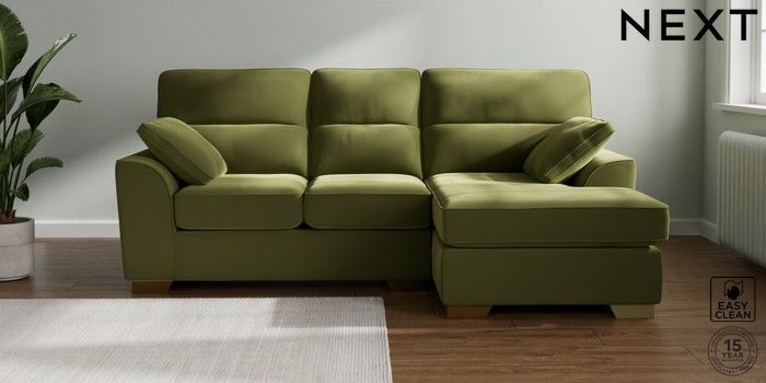 7.3.1 Buy Stamford Highback Small Sofa Chaise - Right Hand Plush Velvet Easy Clean Mid Olive Green Large Square Angle - Brushed Brass from the Next UK online shop Click here to use our accessible website