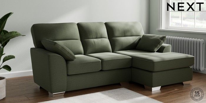 7.3.1 Buy Stamford Highback Small Sofa Chaise - Right Hand Relaxed Linen Look Dark Green Large Square Angle - Chrome Metal from the Next UK online shop Click here to use our accessible website