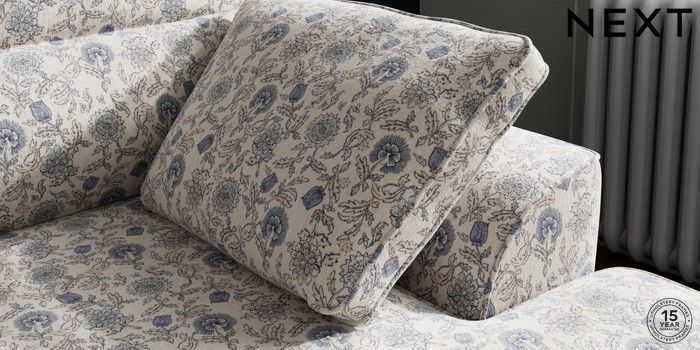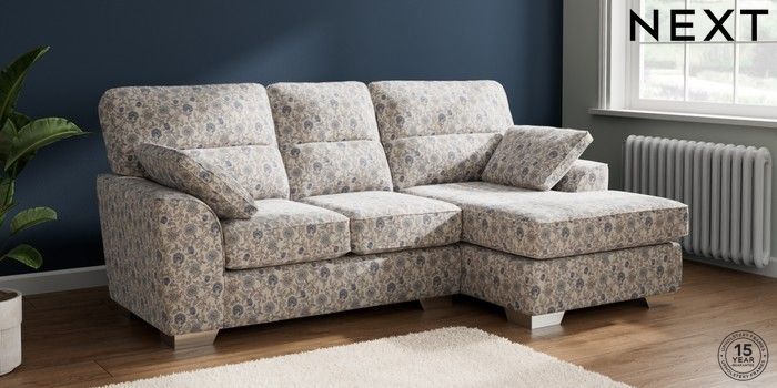7.3.1 Buy Stamford Highback Small Sofa Chaise - Right Hand Relaxed Linen Look Print Woodblock Floral Blue Large Square Angle - Chrome Metal from the Next UK online shop Click here to use our accessible website