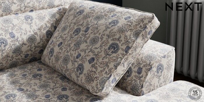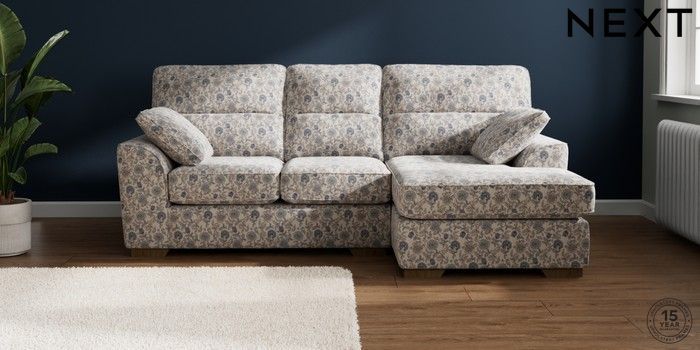 7.3.1 Buy Stamford Highback Small Sofa Chaise - Right Hand Relaxed Linen Look Print Woodblock Floral Blue Large Square Angle - Mid from the Next UK online shop Click here to use our accessible website