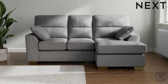 7.2.10 Buy Stamford Highback Small Sofa Chaise - Right Hand Studio Chenille Mid Grey Large Square Angle - Brushed Brass from the Next UK online shop Click here to use our accessible website