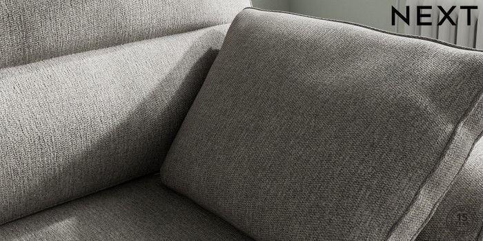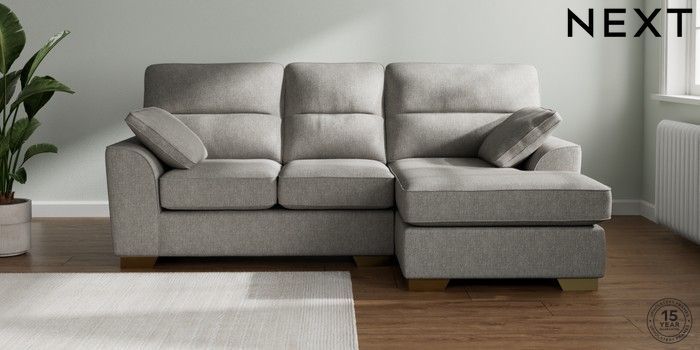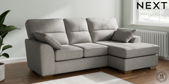 7.2.10 Buy Stamford Highback Small Sofa Chaise - Right Hand Tweedy Chenille Mid Grey Large Square Angle - Brushed Brass from the Next UK online shop Click here to use our accessible website