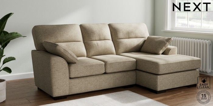 7.2.10 Buy Stamford Highback Small Sofa Chaise - Right Hand Woven Chenille Easy Clean Mid Natural Large Square Angle - Dark from the Next UK online shop Click here to use our accessible website