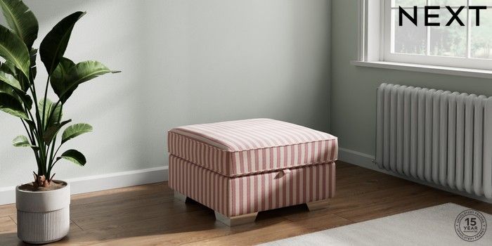 7.3.1 Buy Stamford Highback Storage Footstool Bold Chenille Stripe Dark Pink Square Angle - Chrome Metal from the Next UK online shop Click here to use our accessible website