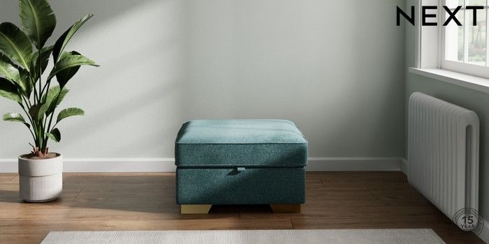 7.2.6 Buy Stamford Highback Storage Footstool Chunky Chenille Mid Teal Green Square Angle - Brushed Brass from the Next UK online shop Click here to use our accessible website