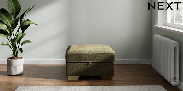 7.2.6 Buy Stamford Highback Storage Footstool Cotswold Chenille Dark Green Square Angle - Brushed Brass from the Next UK online shop Click here to use our accessible website