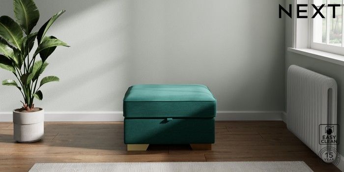 7.2.10 Buy Stamford Highback Storage Footstool Fine Chenille Easy Clean Dark Juniper Green Square Angle - Brushed Brass from the Next UK online shop Click here to use our accessible website