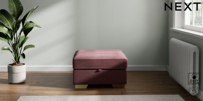 7.2.10 Buy Stamford Highback Storage Footstool Fine Chenille Easy Clean Mid Mulberry Purple Square Angle - Brushed Brass from the Next UK online shop Click here to use our accessible website