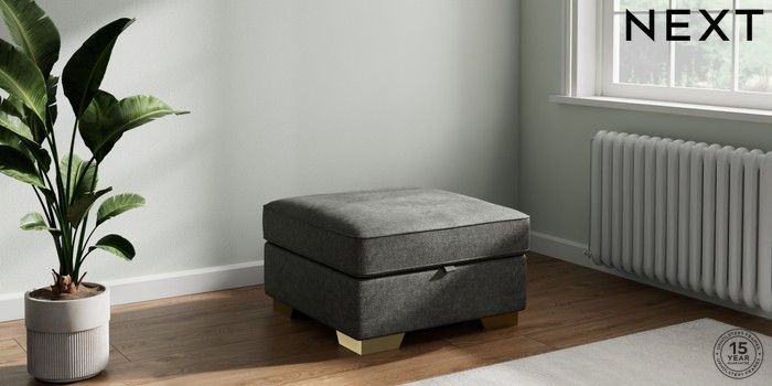 7.2.10 Buy Stamford Highback Storage Footstool Plush Chenille Dark Grey Square Angle - Brushed Brass from the Next UK online shop Click here to use our accessible website