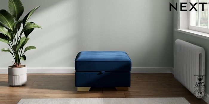 7.2.10 Buy Stamford Highback Storage Footstool Plush Velvet Easy Clean Navy Blue Square Angle - Brushed Brass from the Next UK online shop Click here to use our accessible website