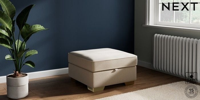 7.2.10 Buy Stamford Highback Storage Footstool Tweedy Blend Easy Clean Oyster Square Angle - Brushed Brass from the Next UK online shop Click here to use our accessible website