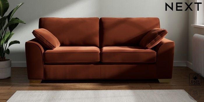 7.2.6 Buy Stamford 3 Seater Sofa Plush Velvet Easy Clean Ginger Orange Large Square Angle - Brushed Brass from the Next UK online shop Click here to use our accessible website