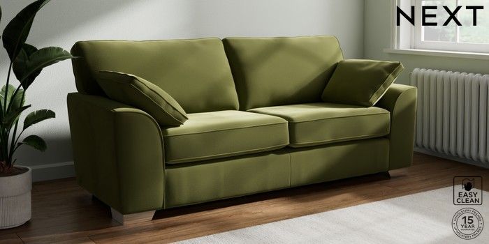 7.3.1 Buy Stamford 3 Seater Sofa Plush Velvet Easy Clean Mid Olive Green Large Square Angle - Chrome Metal from the Next UK online shop Click here to use our accessible website