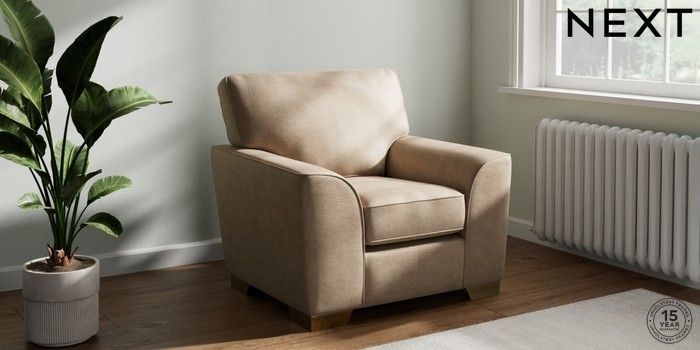 7.2.10 Buy Stamford Armchair Luxe Chenille Mid Camel Beige Square Angle - Brushed Brass from the Next UK online shop Click here to use our accessible website