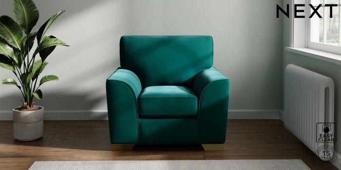 7.3.1 Buy Stamford Armchair Plush Velvet Easy Clean Juniper Green Square Angle - Brushed Brass from the Next UK online shop Click here to use our accessible website