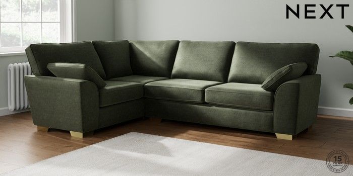 6.12.1 Buy Stamford Large Corner Sofa - Left Hand Luxe Chenille Mid Green Large Square Angle - Brushed Brass from the Next UK online shop Click here to use our accessible website