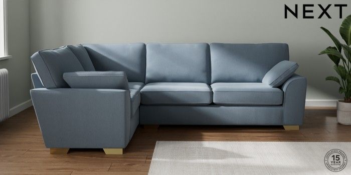 7.2.10 Buy Stamford Large Corner Sofa - Left Hand Relaxed Linen Look Mid Blue Large Square Angle - Brushed Brass from the Next UK online shop Click here to use our accessible website