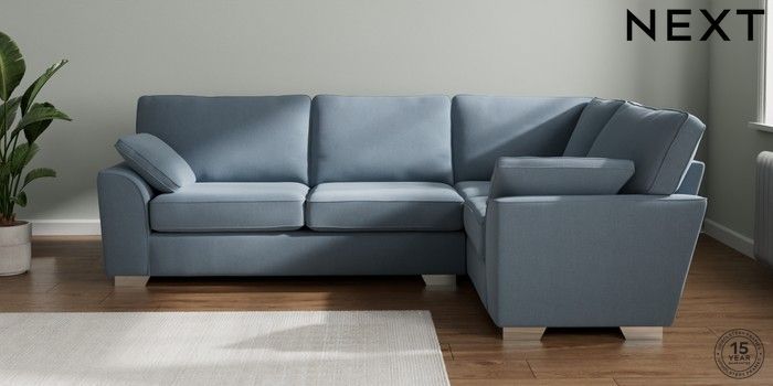 7.2.10 Buy Stamford Large Corner Sofa - Right Hand Relaxed Linen Look Mid Blue Large Square Angle - Chrome Metal from the Next UK online shop Click here to use our accessible website