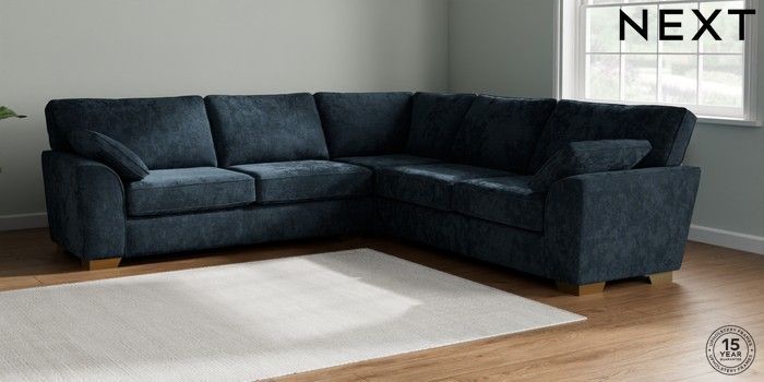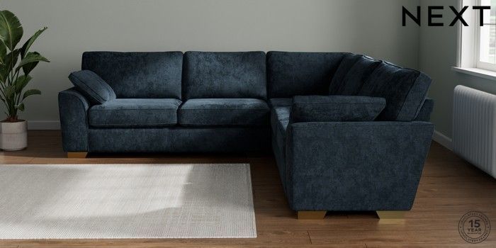 7.2.10 Buy Stamford Large Corner Sofa - Universal Distressed Velour Midnight Blue Large Square Angle - Brushed Brass from the Next UK online shop Click here to use our accessible website