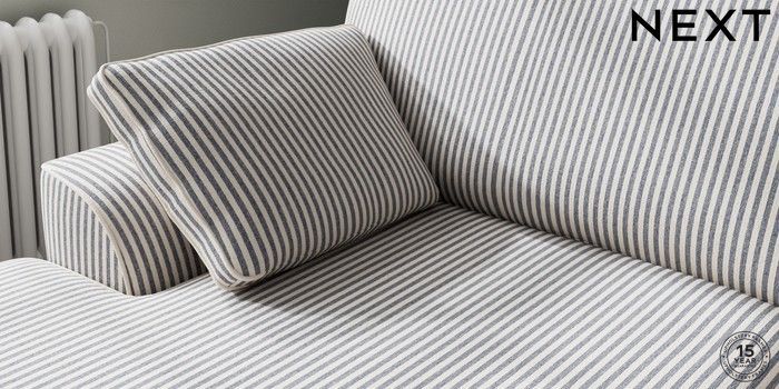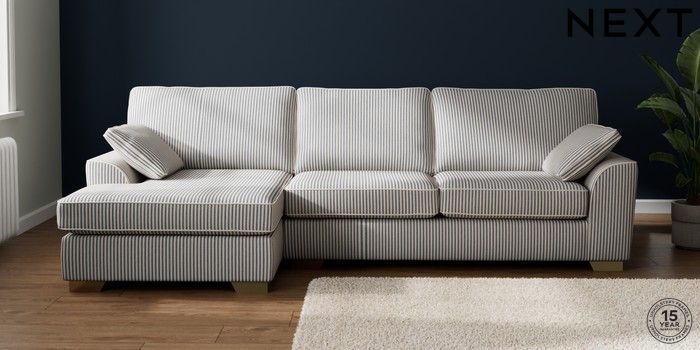 7.3.1 Buy Stamford Large Sofa Chaise - Left Hand Chenille Stripe Slate Blue Large Square Angle - Brushed Brass from the Next UK online shop Click here to use our accessible website