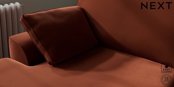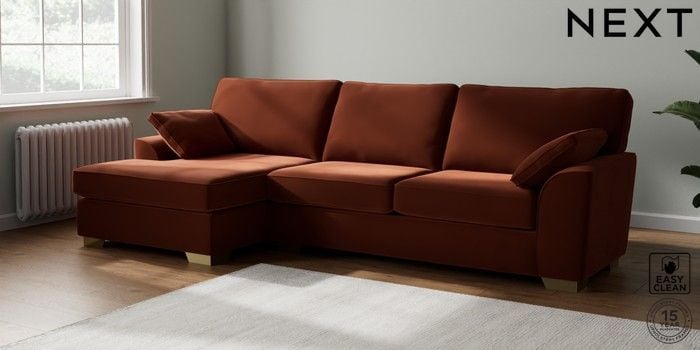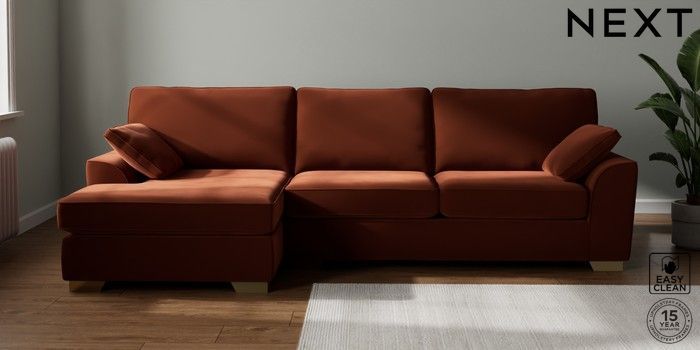 7.2.10 Buy Stamford Large Sofa Chaise - Left Hand Plush Velvet Easy Clean Ginger Orange Large Square Angle - Brushed Brass from the Next UK online shop Click here to use our accessible website