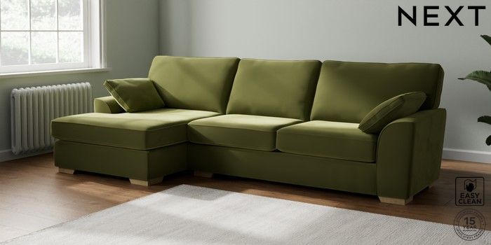7.2.6 Buy Stamford Large Sofa Chaise - Left Hand Plush Velvet Easy Clean Mid Olive Green Large Square Angle - Light from the Next UK online shop Click here to use our accessible website