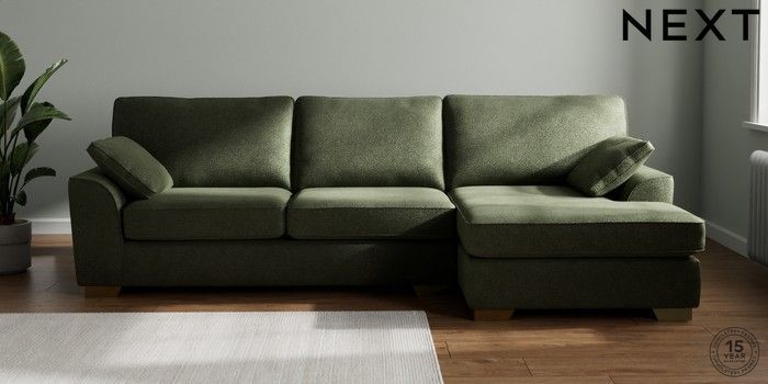 7.3.1 Buy Stamford Large Sofa Chaise - Right Hand Boucle Chenille Dark Moss Green Large Square Angle - Brushed Brass from the Next UK online shop Click here to use our accessible website