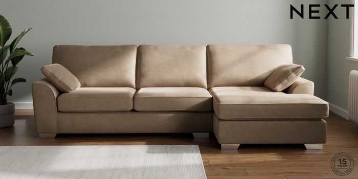 7.2.10 Buy Stamford Large Sofa Chaise - Right Hand Luxe Chenille Mid Camel Beige Large Square Angle - Chrome Metal from the Next UK online shop Click here to use our accessible website