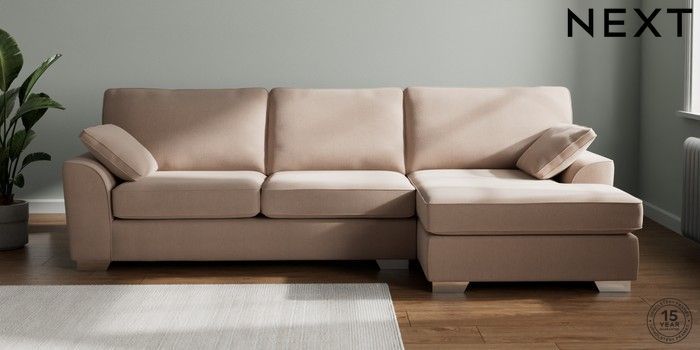 7.3.1 Buy Stamford Large Sofa Chaise - Right Hand Relaxed Linen Look Mid Natural Large Square Angle - Chrome Metal from the Next UK online shop Click here to use our accessible website