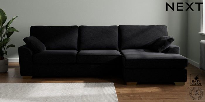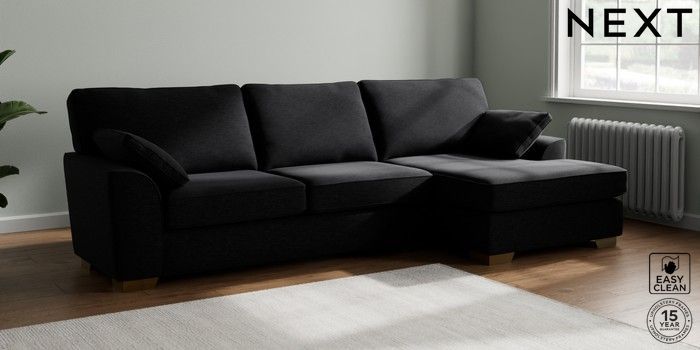 7.2.6 Buy Stamford Large Sofa Chaise - Right Hand Fine Chenille Easy Clean Black Large Square Angle - Brushed Brass from the Next UK online shop Click here to use our accessible website