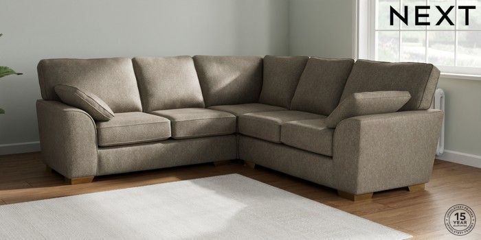 7.2.6 Buy Stamford Medium Corner Sofa - Universal Cotswold Chenille Mid Mink Brown Large Square Angle - Brushed Brass from the Next UK online shop Click here to use our accessible website